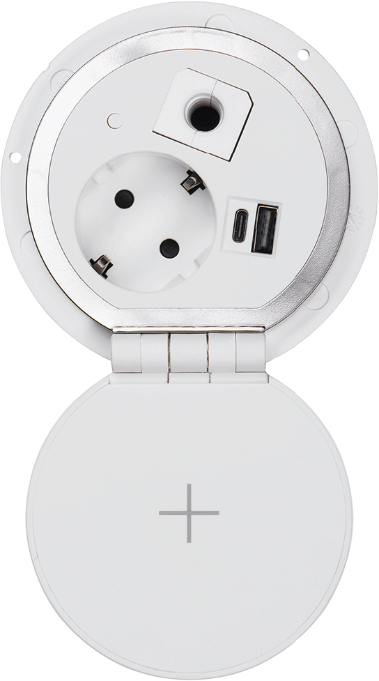 [DESCRIPTION] => Блок розеток 51 1 секции серебро+белый механичский d-80мм 2 USB беспроводная зарядка