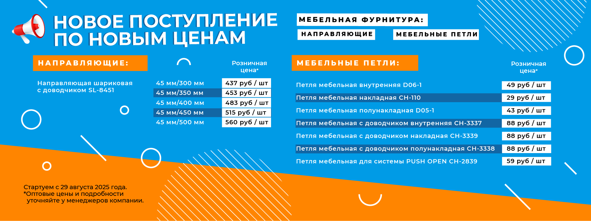 Уважаемые партнеры! Информируем вас о поступлении на склад новой партии мебельной фурнитуры.С 29 августа ЦЕНЫ СНИЖЕНЫ на часть ассортимента направляющих и мебельных петель.